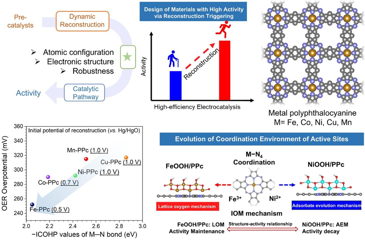 电解水制氢是实现碳中和目标的关键清洁能源技术,而OER的缓慢动力学是制约电解效率的核心瓶颈。尽管贵金属基催化剂表现出优异的性能,但其高昂的成本和稀缺性限制了其大规模应用。开发高效稳定的OER催化剂至关重要。当前OER催化剂研究中,虽关注到催化剂动态重构现象,但普遍忽视动态重构与反应机理转变、催化稳定性间的内在关联,缺乏对结构重构-反应机理-稳定性完整关系的系统认知,导致难以实现催化剂结构的靶向设计,使其重构物种难同时兼具优化活性与长期稳定性,这是该领域当前面临的一大挑战。针对此,以含Fe/Co/Ni/Mn/Cu不同金属中心的酞菁类框架材料展开研究,结合原位表征与DFT计算发现,金属中心通过调控金属氮键能决定重构动力学,弱金属氮键材料可在低电位快速形成高活性羟基氧化物相,强金属氮键材料则重构延迟;且重构会驱动机理定向转变,部分材料从分子内氧耦合机制转向晶格氧机制,部分转向吸附物演化机制,这种机理转变直接决定催化稳定性差异。这一成果为高稳定OER催化剂精准设计提供理论基础。